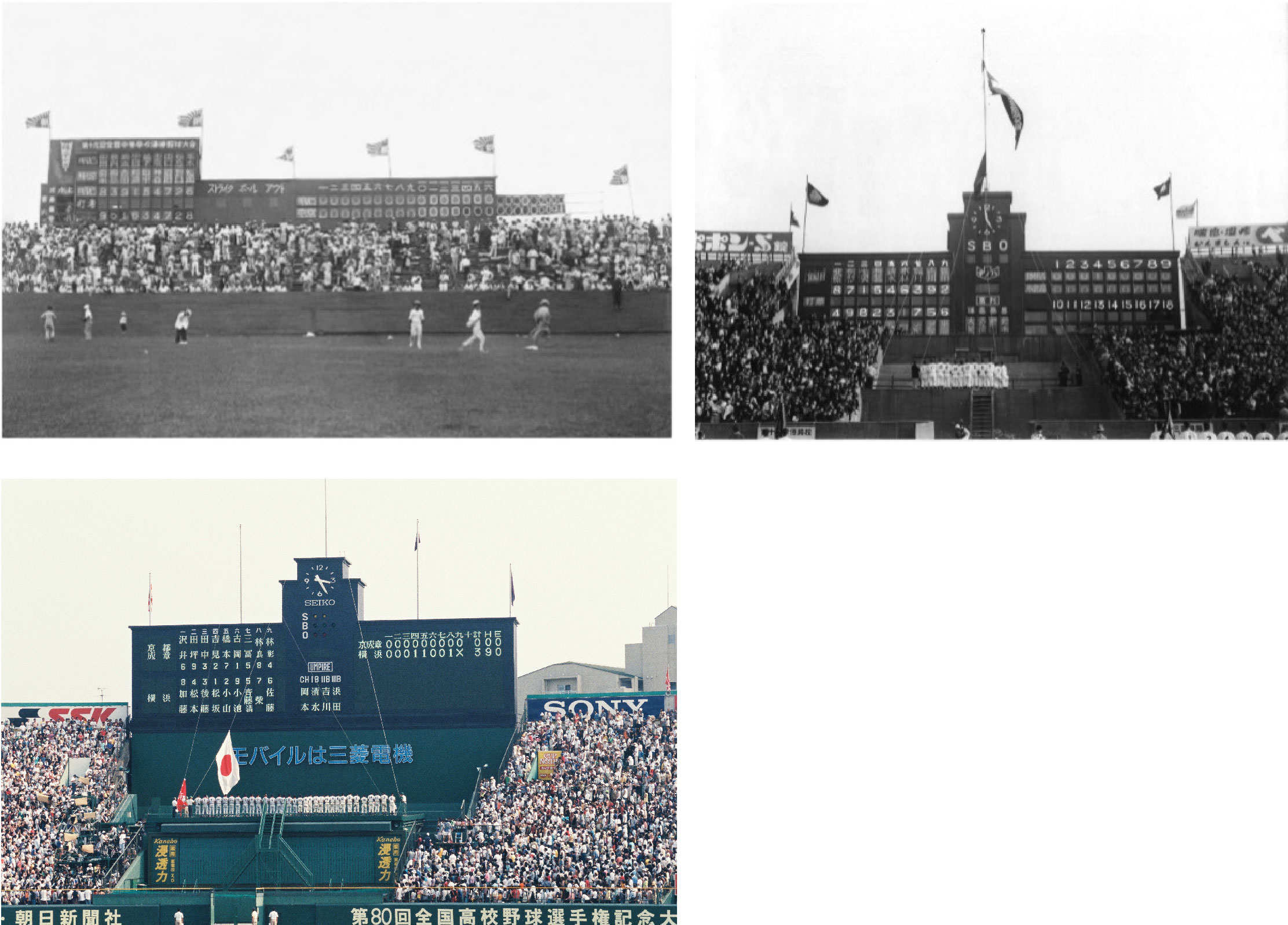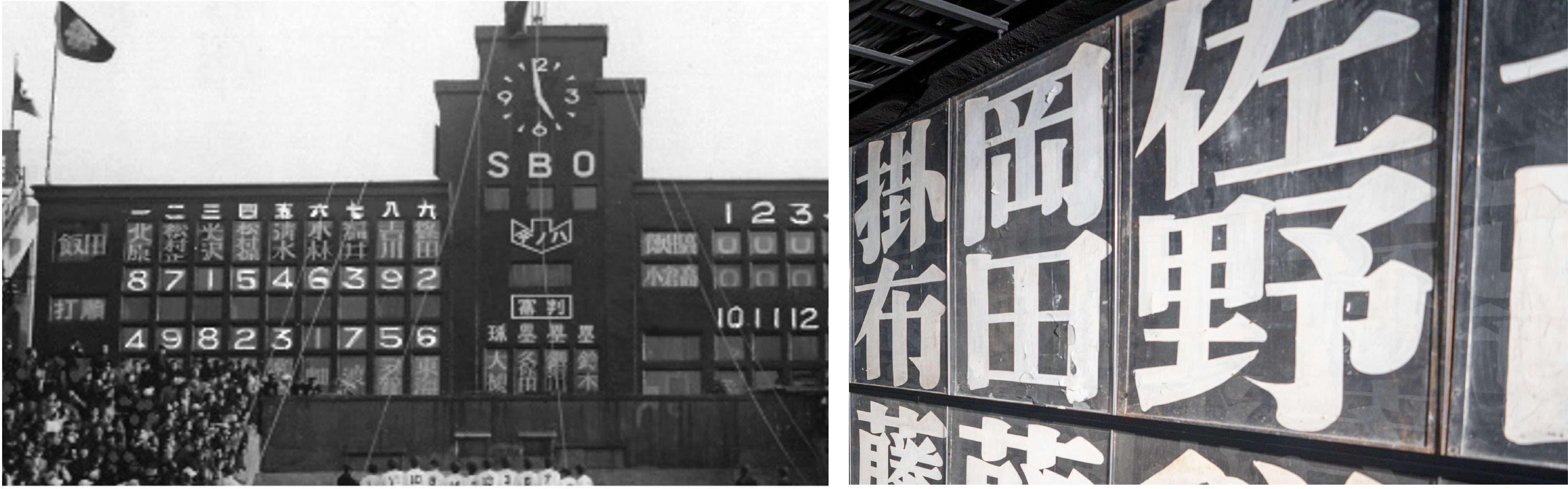 1934年には2代目スコアボードに代わり、木製からコンクリート製となり、戦火を乗り越え、約半世紀にわたって使用されました。さらに1984年以降は3代目スコアボードに代わり、文字表示が手書きの黒板から電光掲示方式へと変更されました。黒地のボードに白色ブラウン管を採用することで、先代のスコアボードの姿を継承し、選手名・チーム名表記には、手書き時代を踏襲した字体が使用されました。