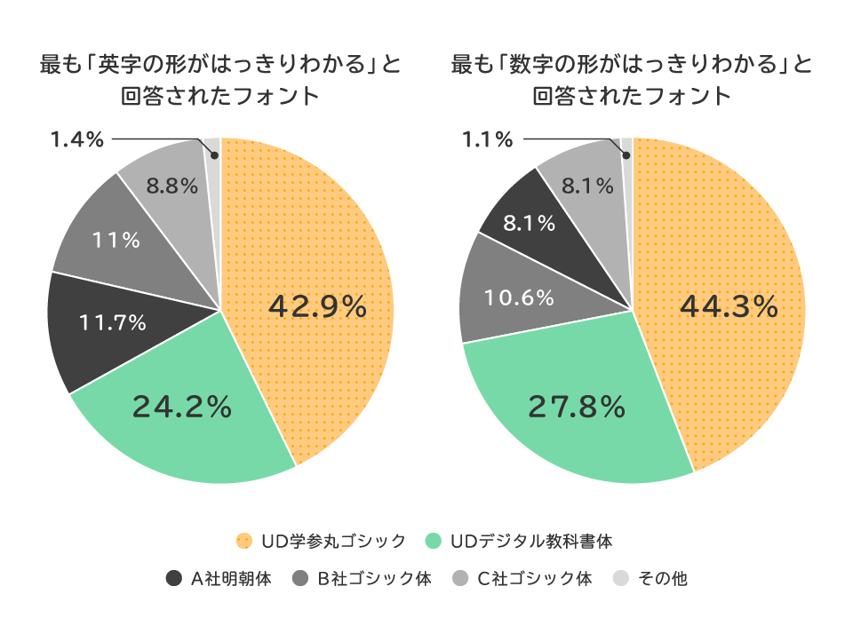 福岡教育大学での学生約273名を対象としたアンケート調査では、複数の書体を比較した結果、4割以上の学生が「UD学参丸ゴシック」を最も英数字の形がはっきりわかる書体と回答しました。