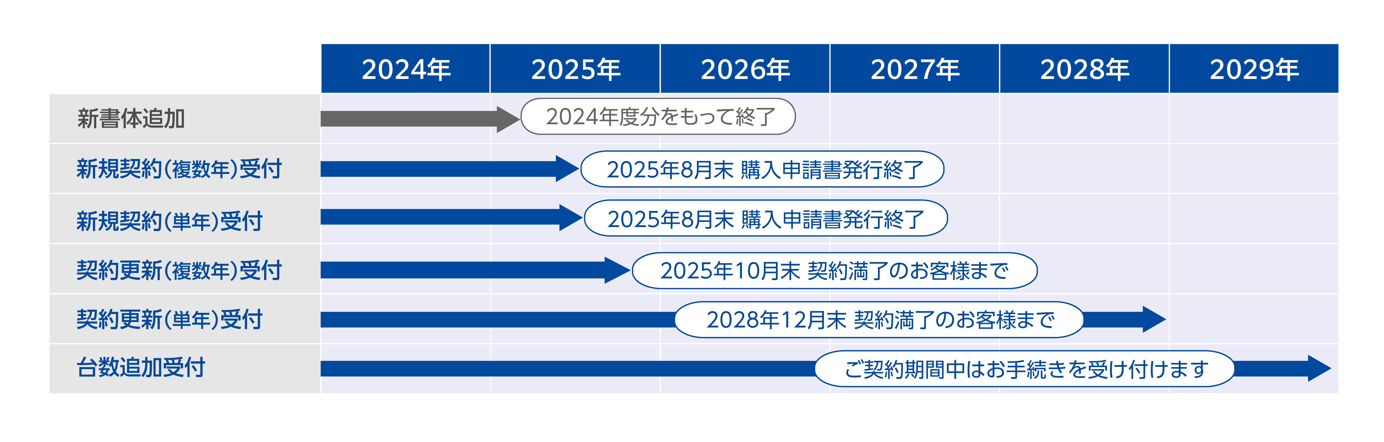 新規のご契約は、複数年一括・単年ともに2025年8月末をもって購入申請書の発行を終了します。また更新に関するお手続きは、複数年一括ご契約の場合2025年10月末に契約満了のお客様まで、単年ご契約の場合2028年12月末に契約満了のお客様まで受け付けます。ご契約期間中における台数追加は承ります。詳細はこちらをご覧ください。