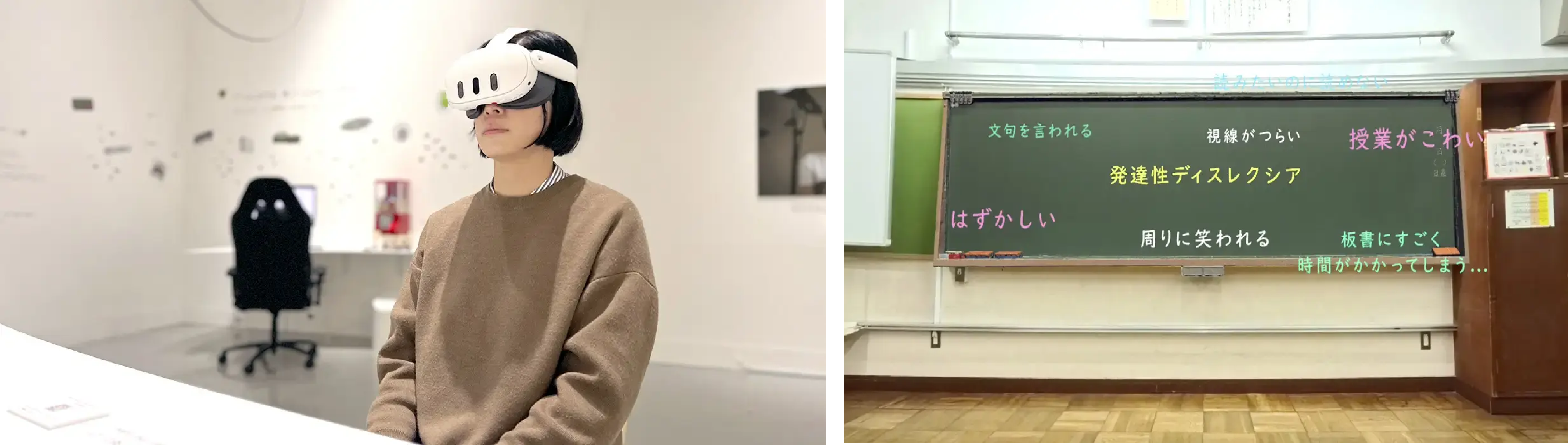 この度、モリサワの展示ブースでは、ディスレクシア(※)への理解を深める機会として、資生堂クリエイティブ株式会社の提供によるVRコンテンツ『もしもディスレクシアの小学生なら』を展示します。このコンテンツは、来場者がディスレクシアに悩む小学生の状況をVRによって疑似体験できる内容で、ディスレクシアの生徒の授業中の困難さを再現しています。