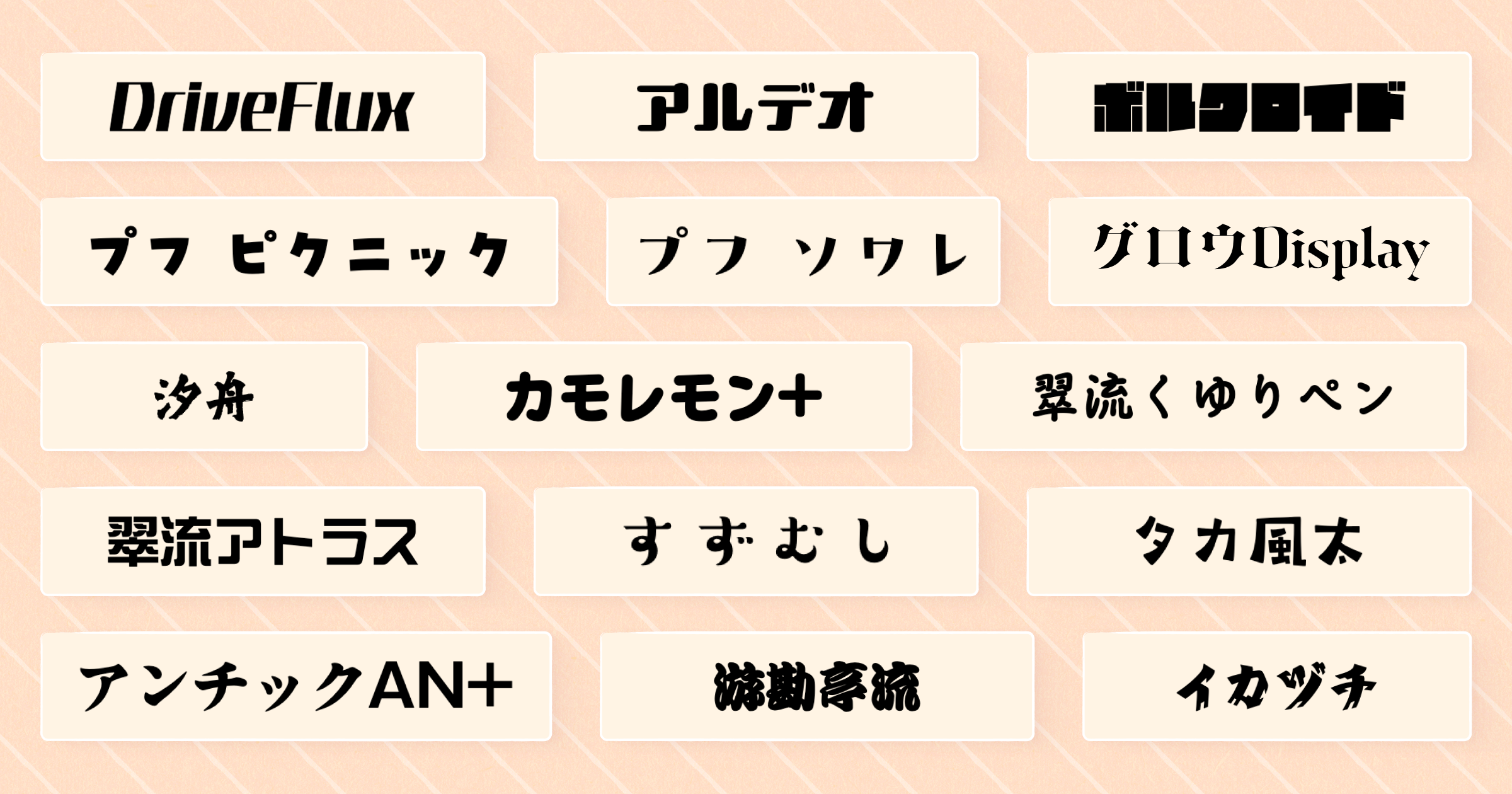 提供するフォントは、力強さやスピード感を細部まで表現できるバリアブルフォント「DriveFlux(ドライブフラックス)」から厳選した7スタイルに加え、「プフ ピクニック」など人気の高いデザイン書体を中心とした計15書体です。個性的なフォントが、オリジナルグッズをより魅力的に演出します。