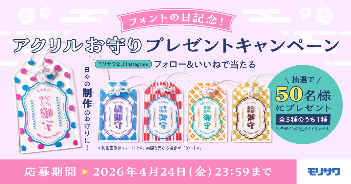 またモリサワでは、4月10日の「フォントの日」を記念し、2026年4月10日(金)〜2026年4月24日(金)の期間、抽選で50名様に特製アクリルお守りをプレゼントするキャンペーンを実施します。