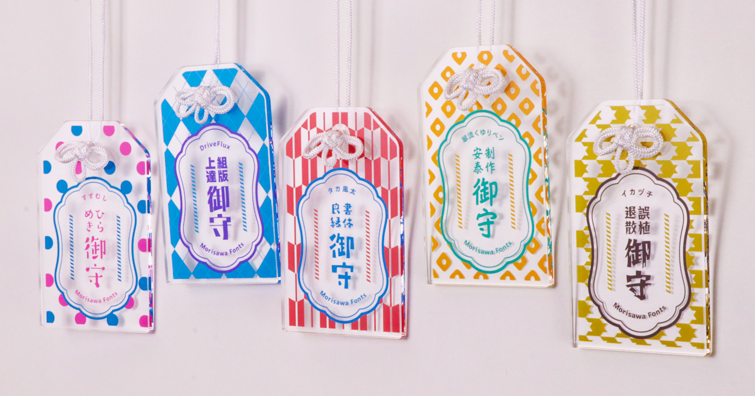 今回は「pixivFACTORY」に提供したフォントを使って、同サービス内のアクリルお守りをオリジナルデザインで制作しました。お守りは、制作に携わる方にとって縁起の良い「ひらめき御守」、組版や文字にまつわるデザインにちなんだ「組版上達御守」など、制作安泰の願いを込めた全5種類です。お守りに記された言葉は当社が遊び心で創作したもので、それぞれの言葉に合うフォントを選んでデザインしました。ぜひ身につけていただき、日々の制作を見守るお守りとしてお楽しみください。