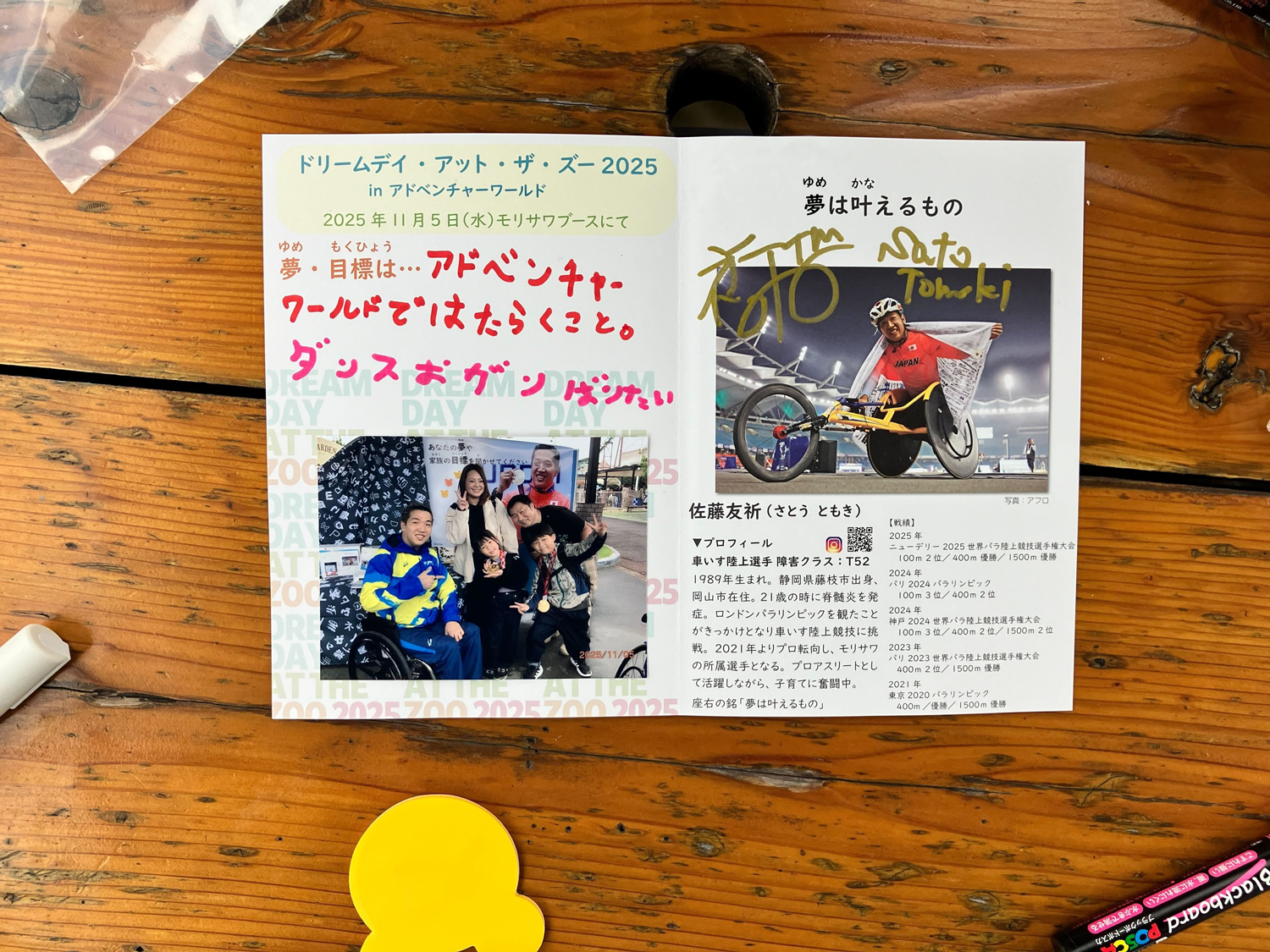 私たちモリサワは、2025年11月5日(水)に開催された和歌山ドリデイ実行委員会主催の「ドリームデイ・アット・ザ・ズー 2025 in アドベンチャーワールド」(以下、ドリデイ)に2023年から協賛を続けています。3回目となった今回は、初めて企業ブースを出展し、モリサワ所属のパラ陸上選手 佐藤友祈選手とゲストのグリーティングなど新たな企画も行いました。ドリデイとは、全国から18歳以下の障害のある子どもとその家族1,000組・約4,000名がアドベンチャーワールドに1日無料招待されるイベントです。当日は貸切りで営業されるため、障害のある子どもたちやその家族が遊園地や動物園・水族館で、普段は気兼ねしてしまう周囲の目も気にせずに思い切り楽しめます。来場の申し込みはすぐに定員を超え、抽選となる大人気イベントです。