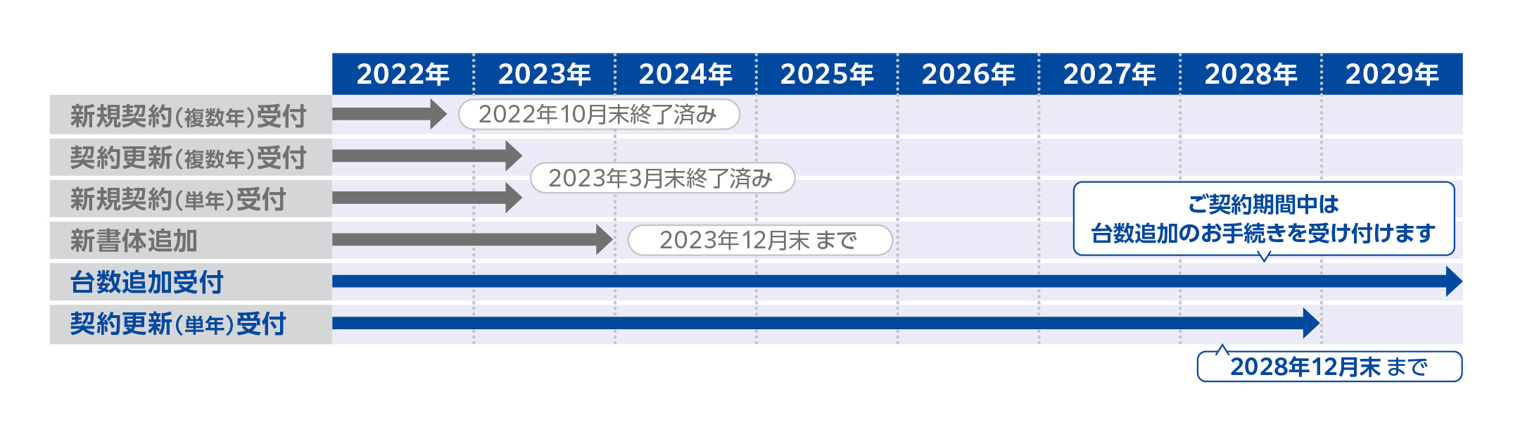 契約更新(単年)受付は2028年12⽉31⽇、サービスのご提供は2029年12⽉31⽇をもって終了します。