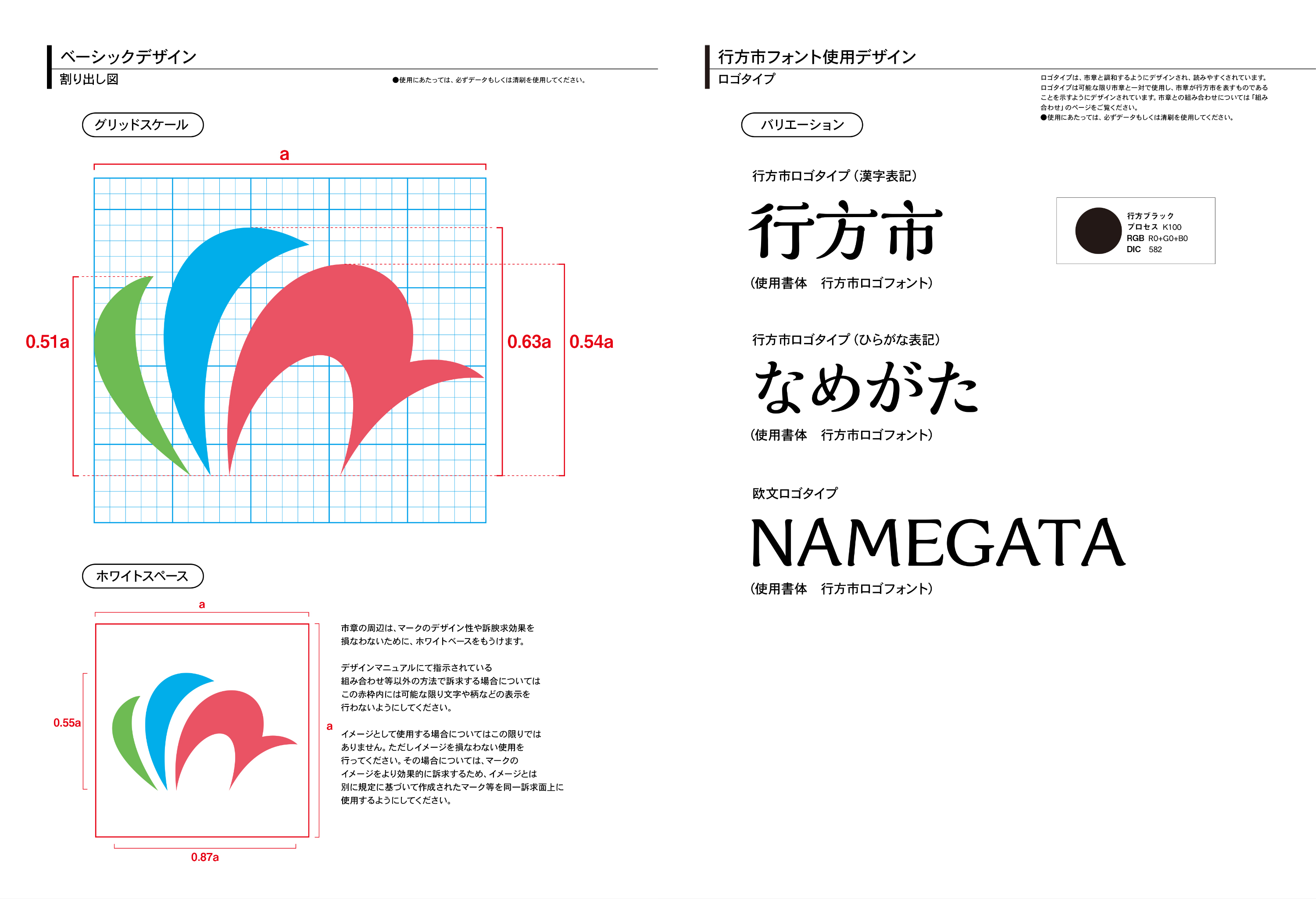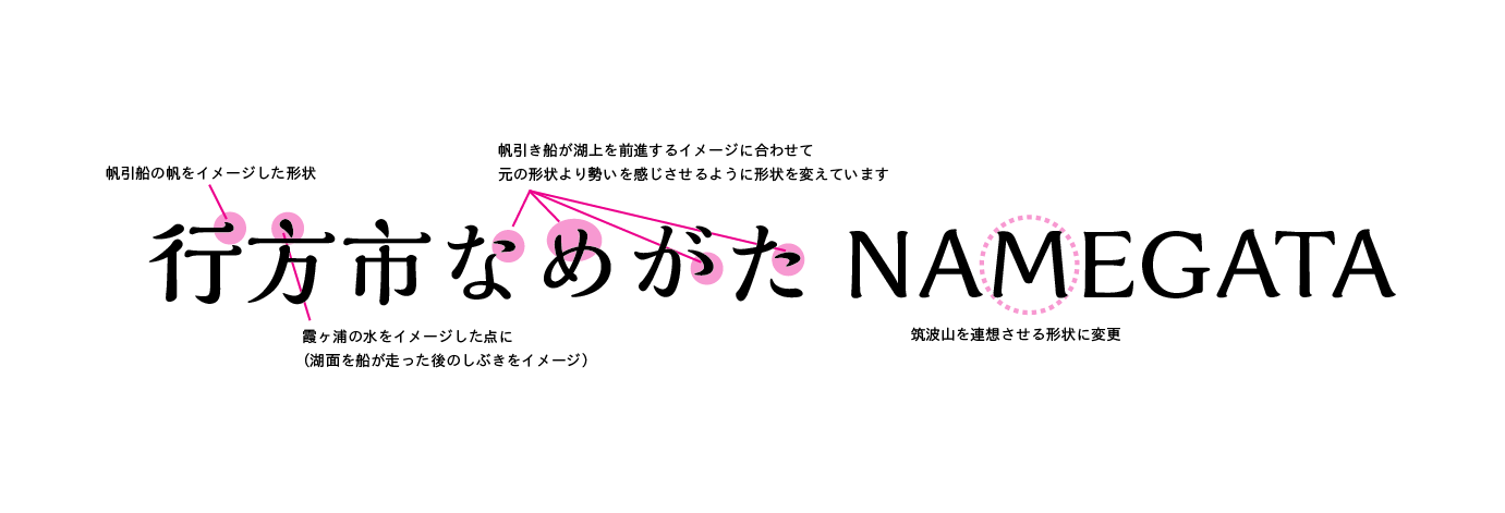 また、行方市フォントにおける「行方市」「なめがた」「NAMEGATA」のロゴタイプも用意しています。例えば「方」の点は霞ヶ浦の水をイメージした形状に、ローマ字の「M」は筑波山を連想させる形状にカスタマイズするといった具合です。完成後の展開については、市長から「筑波山を望める霞ヶ浦沿いのサイクリングロードで、山とMの文字が重なる場所に看板を設置し、フォトスポットにしてはどうか」というアイデアも出ています。これまで行方市らしさが見えにくかった場所においても、視覚的にその魅力を感じてもらえたらと考えています。