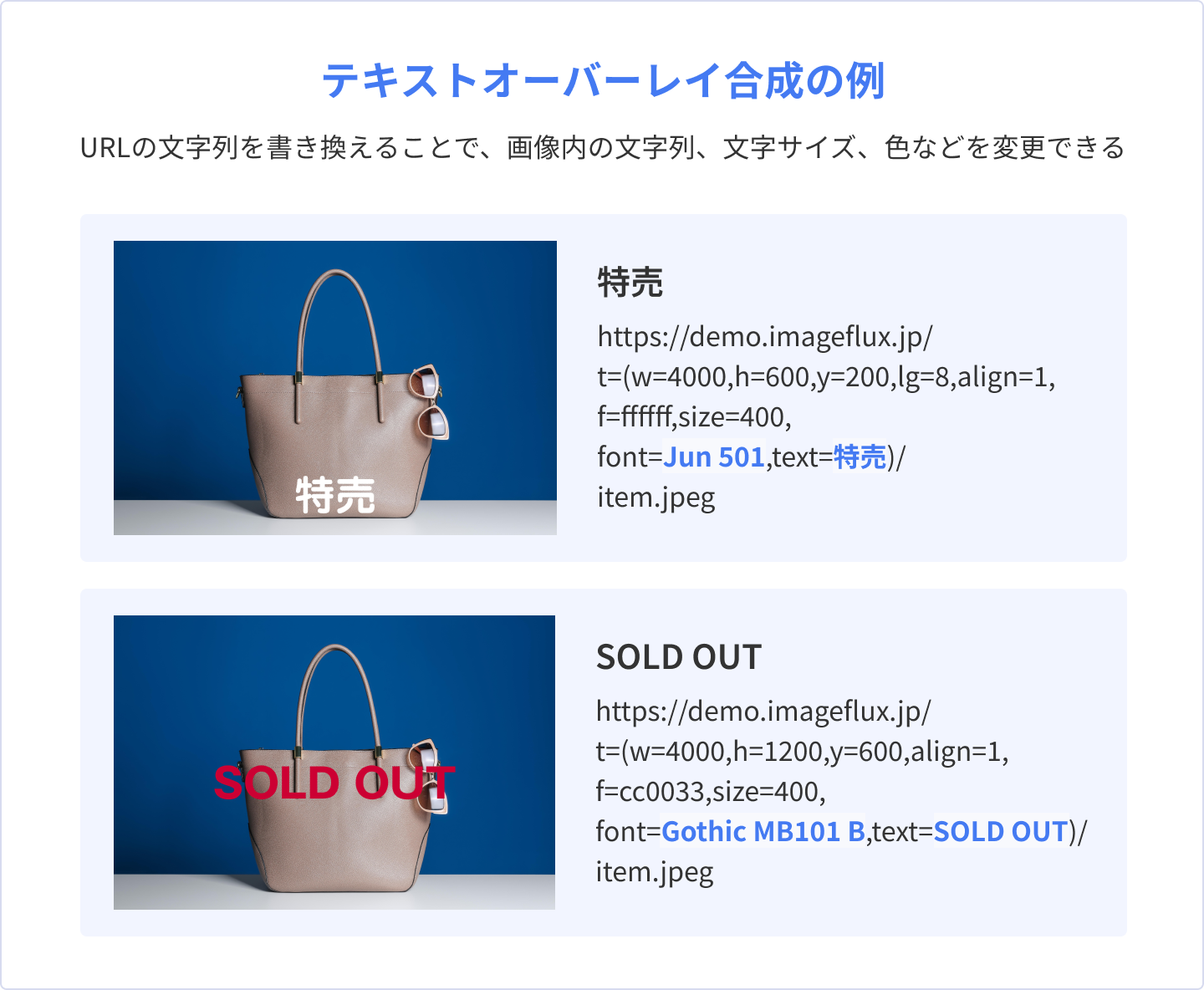 ImageFluxは2016年12月に提供を開始して以来、機能の追加・拡充を重ね、UX向上を図ってきた。2025年4月には、多くのユーザーから要望が寄せられていた「テキストオーバーレイ機能」を追加。画像に任意の文字列を重ねて表示できる機能で、URLパラメーターを指定することにより、フォントの種類やウエイト、表示位置なども調整できる。