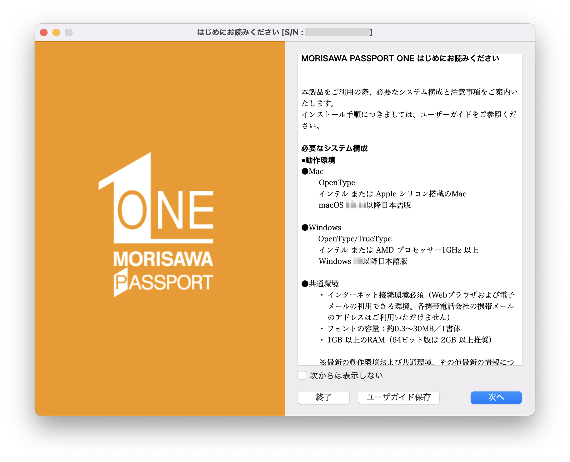 エンドユーザライセンス契約書に同意いただけない場合は、MORISAWA PASSPORT ONEのインストール・ご利用ができません。