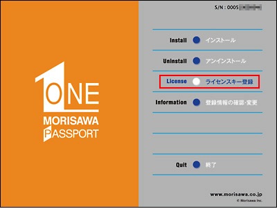 「Mフォントスターター」からMORISAWA PASSPORT ONEのインストーラを起動し、メニュー画面の「ライセンスキー登録」をクリックしてください。