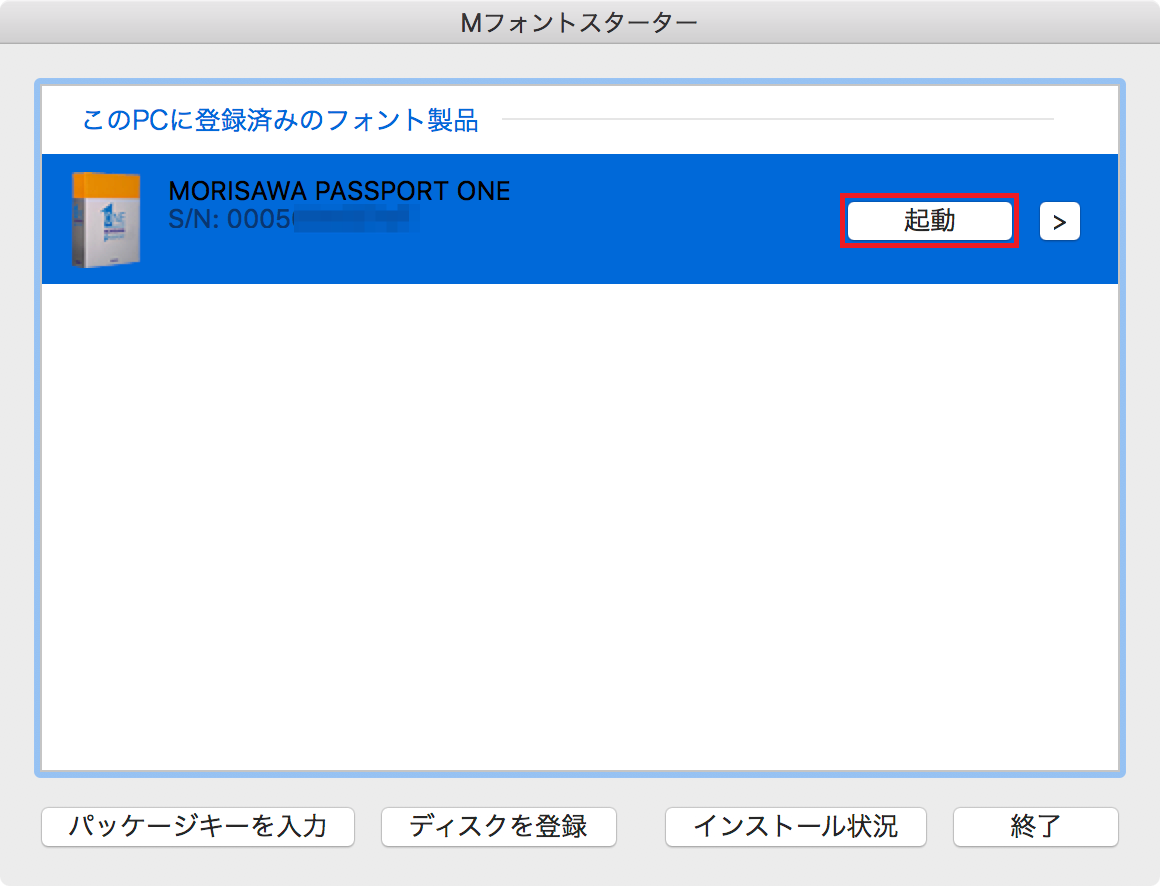 「Mフォントスターター」に表示されたMORISAWA PASSPORT ONEをクリックで選択状態にし、「起動」をクリックしてください。