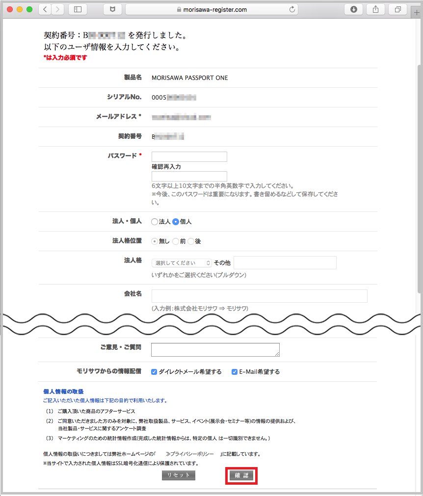 契約番号が自動的に発行され、「パスワード設定/ユーザ情報」の入力画面が表示されます。