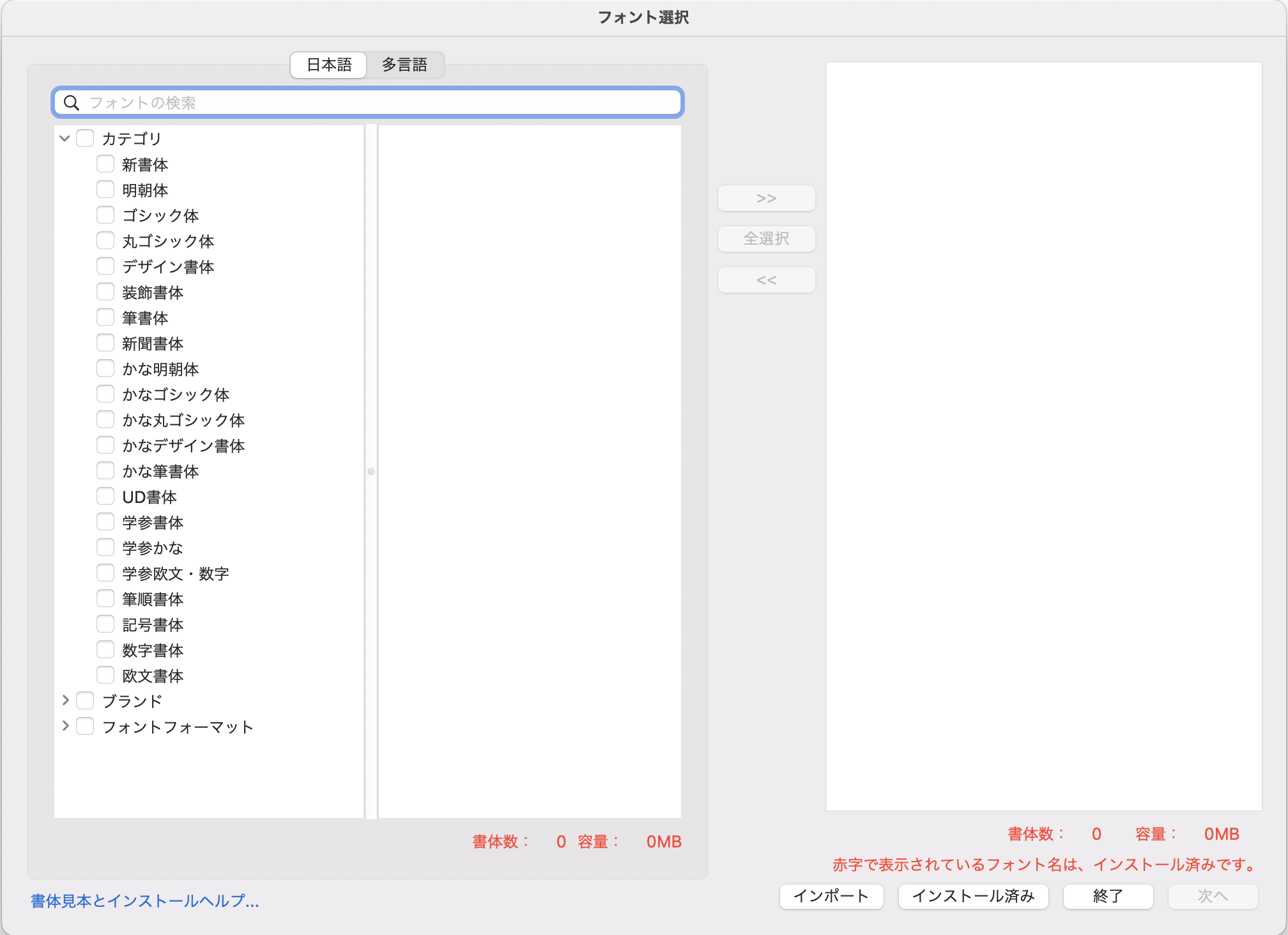 現在選択中の書体数、合計容量が選択画面に表示されています。