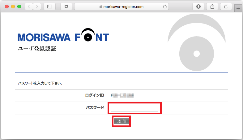 続いてパスワード入力欄に、ユーザ登録時に任意で設定したパスワードを入力し、「送信」をクリックしてください。