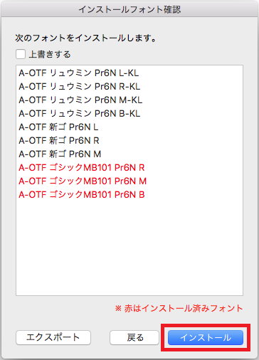 赤文字で表示されたフォントは、既にシステムにインストールされています。