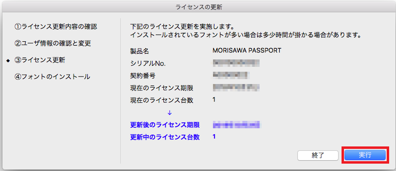 ユーザ情報の確認(変更)後、再度ライセンス更新内容が表示されます。改めて内容をご確認いただき、「実行」をクリックしてください。