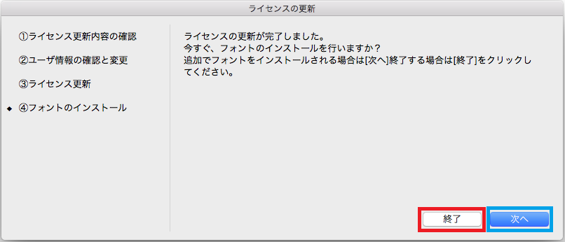 前項、ライセンス更新の完了画面で、「次へ」を選んだ場合、続けてフォントのインストールが可能です。